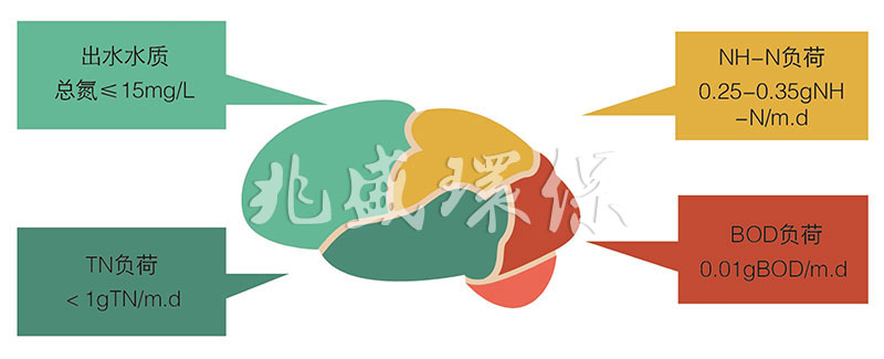 出水水质:总氮≤15mg/L; TN负荷:<1gTN/m2.d; NH3-N负荷:0.25-0.35 g NH3-N/m2.d BOD5负荷:0.01 g BOD/m2.d