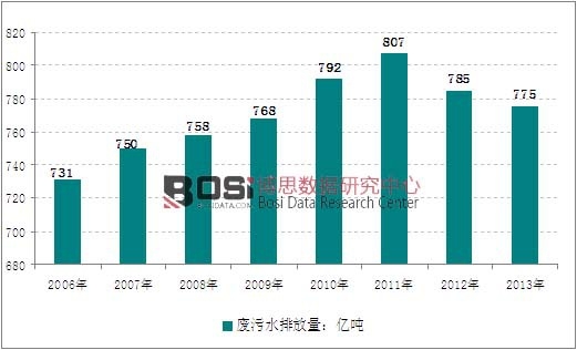 废污水排放量指工业、第三产业和城镇居民生活等用水户排放的水量,但不包括火电直流冷却水排放量和矿坑排水量。根据水利部统计数据2013年我国废污水排放总量775亿t,较2012年下降1.27%。